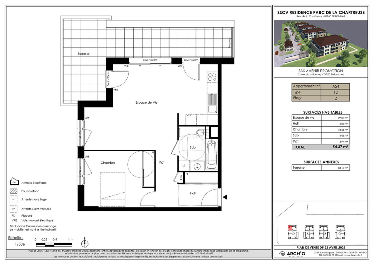 L'agence MARAVILLAS a le plaisir de vous présenter ce programme NEUF d'exception initié par AVENIR PROMOTION, parfaitement intégré dans son environnement naturel et historique. Situé au Parc de la Chartreuse à Péronnas (01), ce projet bénéficie d'une architecture contemporaine, en harmonie avec un site remarquable et préservé. Du T2 au T5, dans des bâtiments de deux étages avec ascenseurs chaque appartement propose de généreux espaces extérieurs, pensés pour votre bien-être. Le chauffage au sol ainsi que le rafraîchissement par pompe à chaleur assurent un confort optimal, été comme hiver. Une place de parking privative par logement Livraison prévue 1er trimestre 2028. frais de notaire réduits. Cet appartement NEUF Type 2 de 54 m2 propose un hall d'entrée, espace de vie de 29 m2, une chambre de 12,26 m2, une salle de bains 5 m2, wc, Terrasse de 23 m2. Orientation NORD.